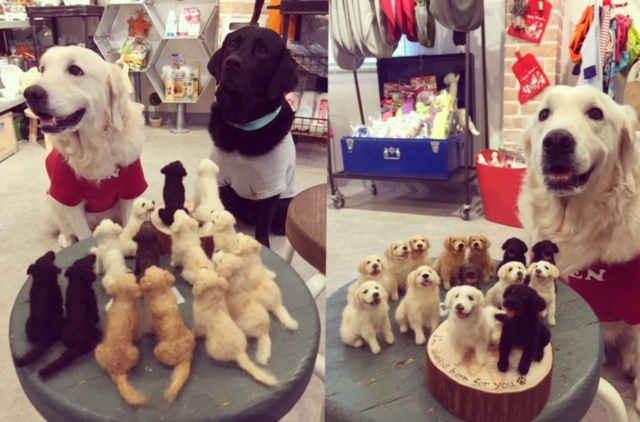 大型犬レトリバーをモチーフに、毛色や体格、表情もみんな違う小さな羊毛フェルト作品は、